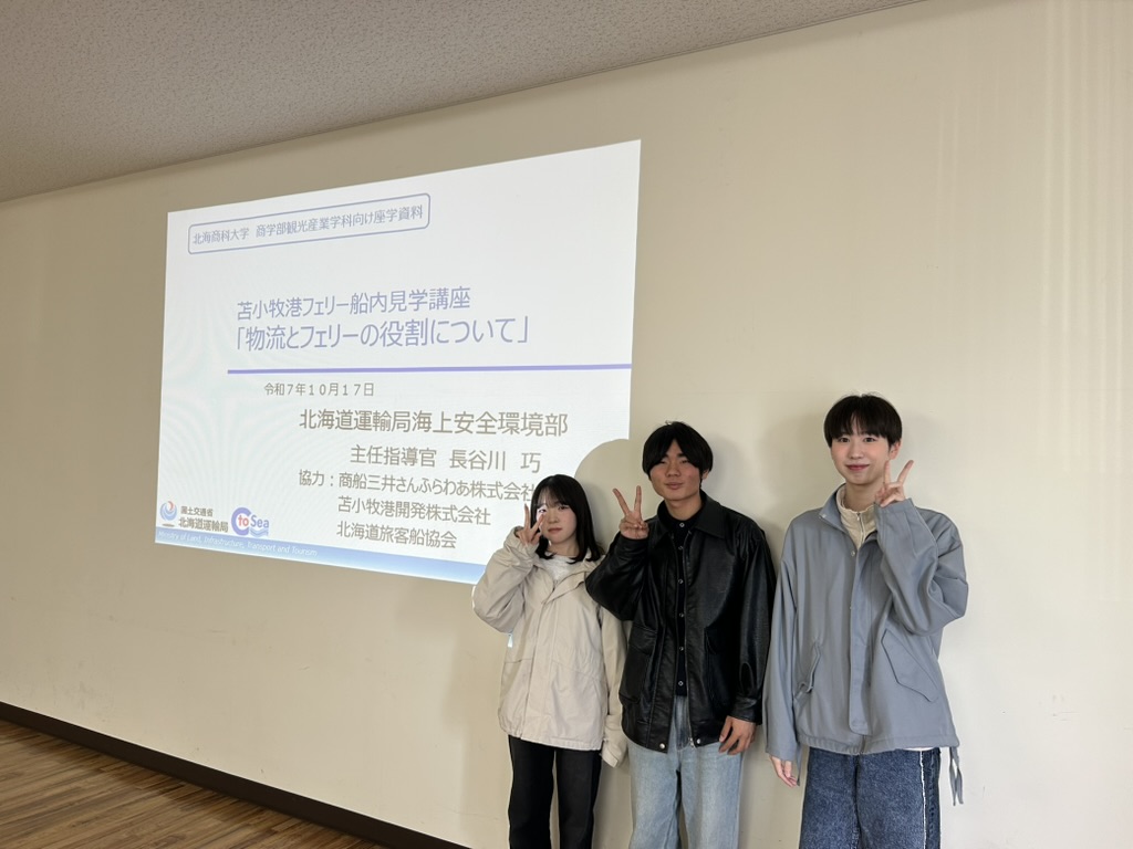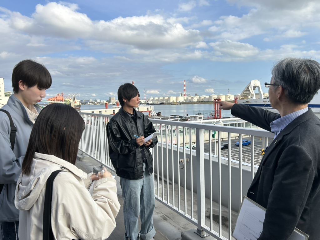 モビリティ(移動・交通)をテーマに研究する千葉ゼミの3名が、フェリーを研究対象に苫小牧西港を訪問しました。港ではまず、北海道の物流を支える苫小牧港の重要な役割や、国内外を行き交う貨物船の仕組みについて、北海道運輸局の方から丁寧な講話をいただきました。