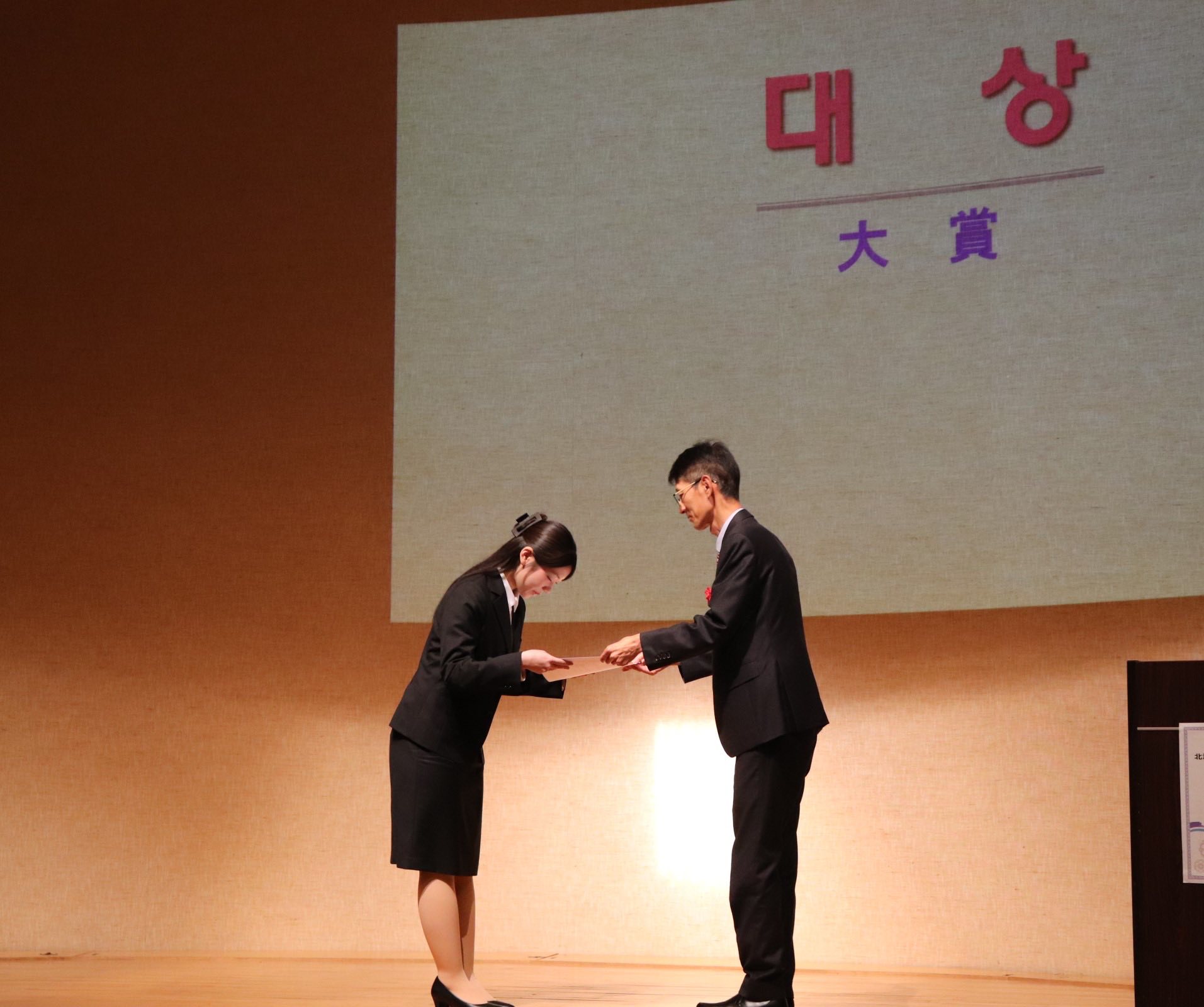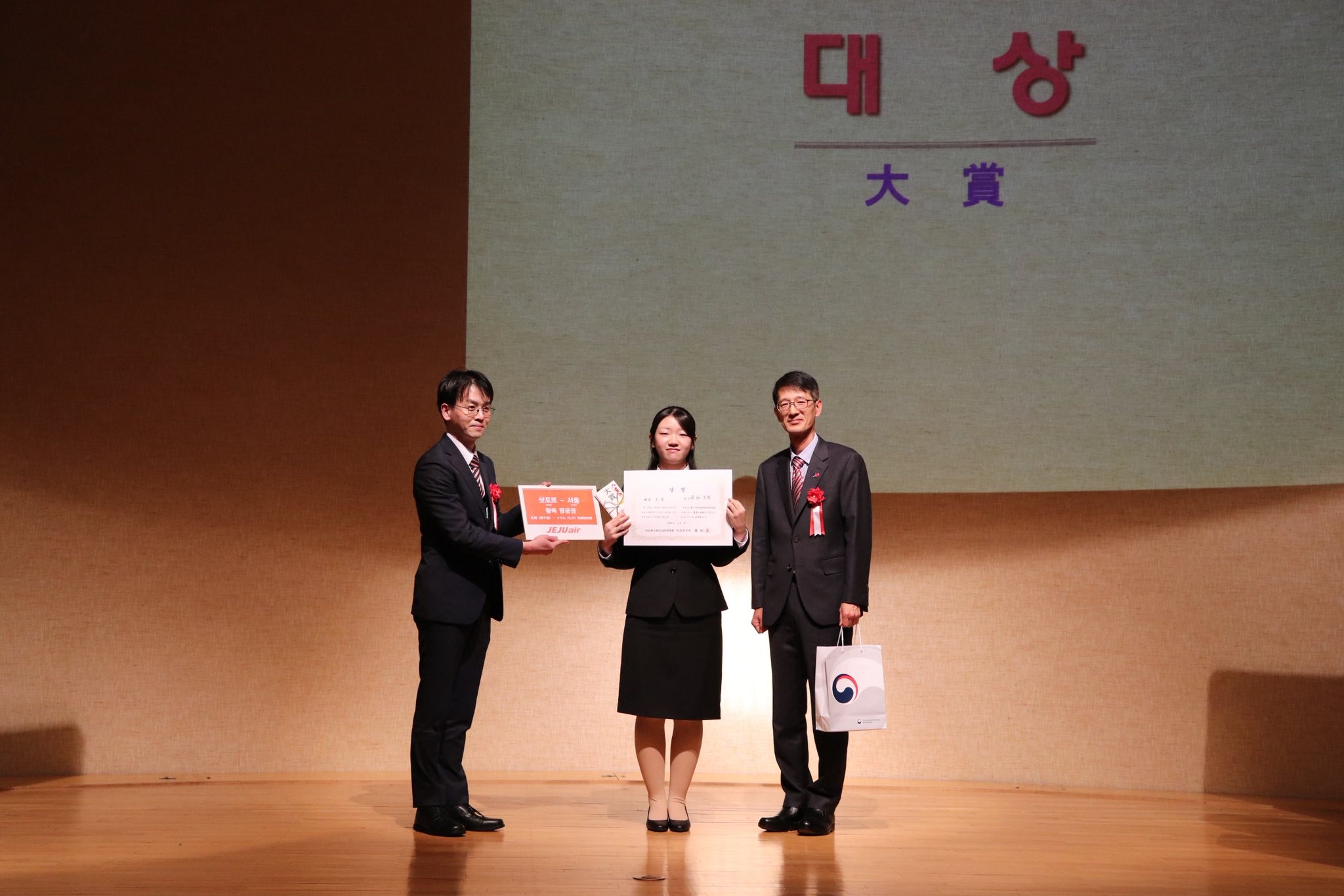 今回、本学の飛谷 百香さんが「韓国料理はなぜ食べたくなるのか」をテーマに大賞(駐札幌大韓民国総領事館総領事賞)を、また小笠原 海麗さんが「韓屋の魅力」をテーマに金賞(在日本大韓民国民団 北海道地方本部 団長賞)を受賞するという快挙を成し遂げました。副賞として、大賞受賞者には新千歳-仁川往復航空券(済州航空提供)2枚が、金賞受賞者には商品券3万円分が授与されました。
