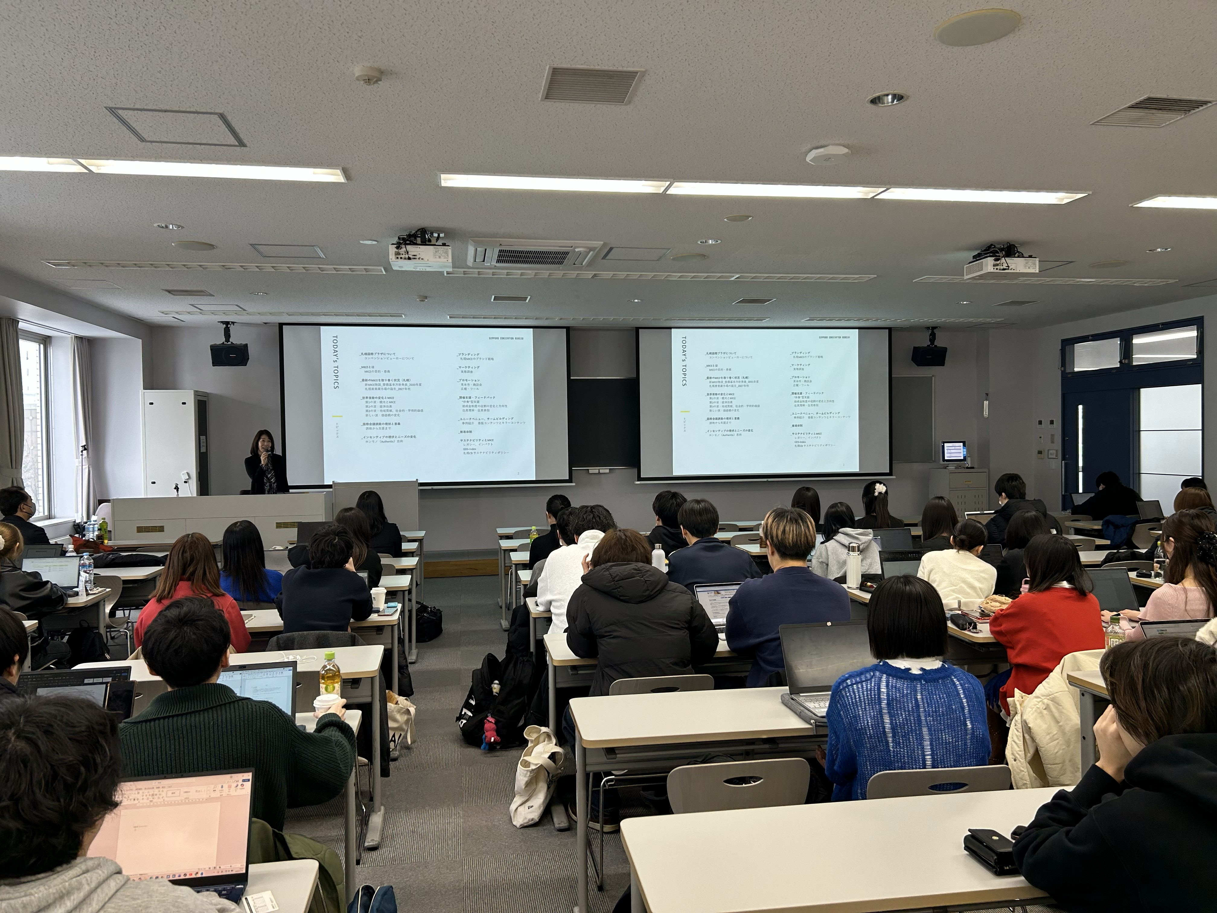 第12回の「観光学I」では、個人旅行ではなく、ビジネス目的で人が集まる MICE(会議・報奨旅行・国際会議・展示会/イベント)をテーマに、札幌コンベンションビューロー 部長 荻麻里子氏をお招きし、ご講演いただきました。