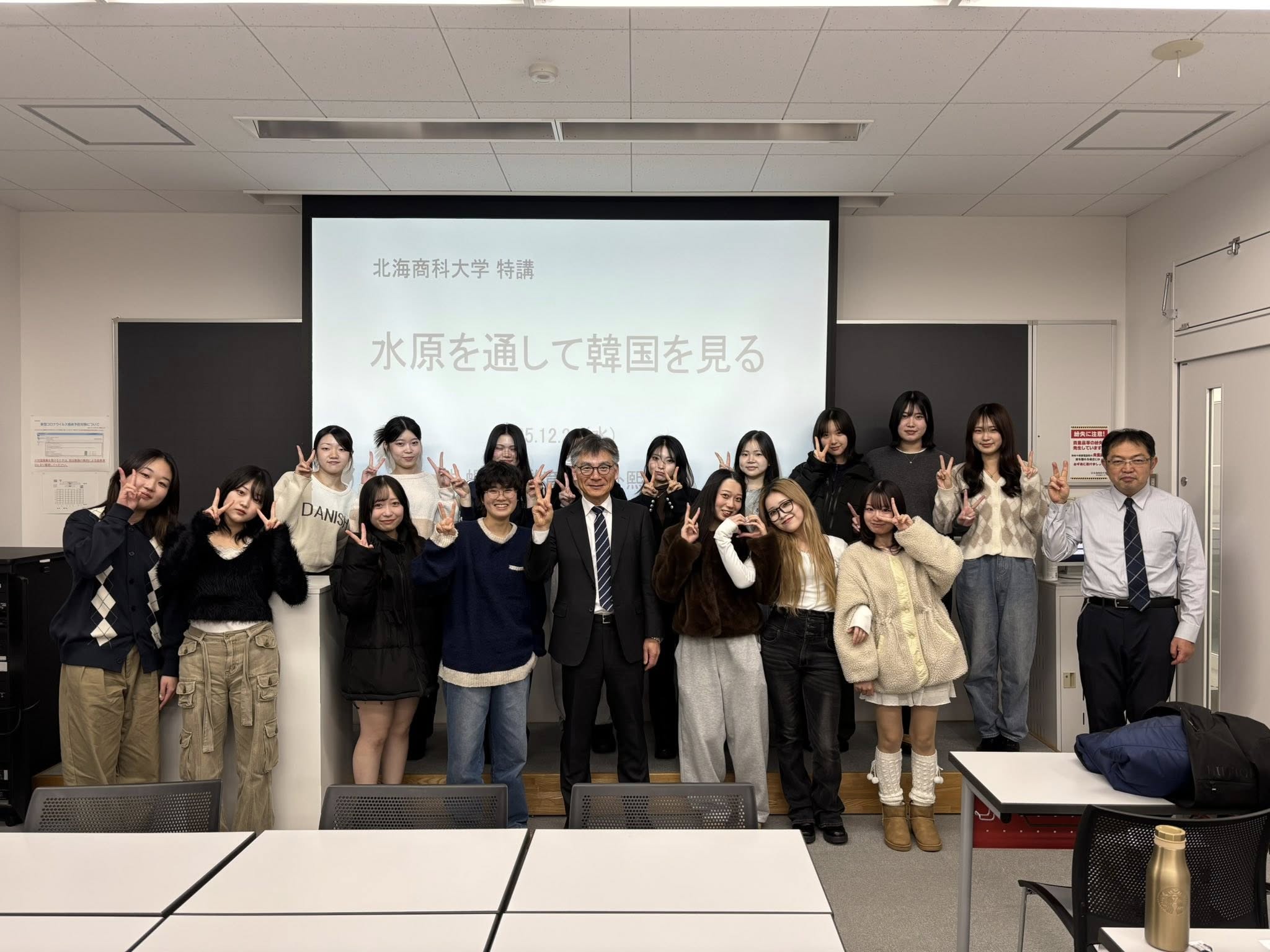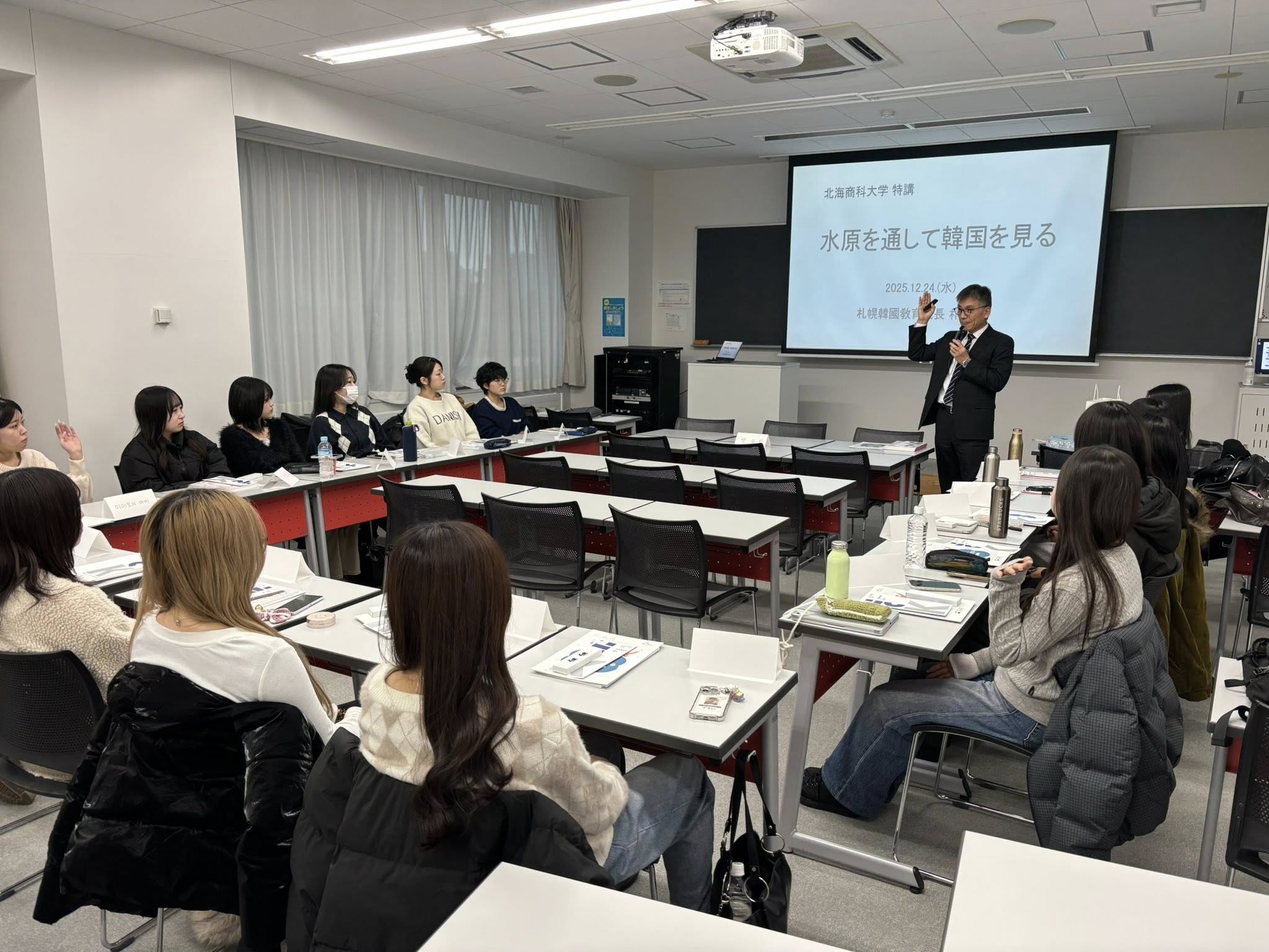 12月24日、本学の「韓国語会話・作文Ⅱ」(担当教員:李鳳)の授業において、札幌韓国教育院の朴熙喆院長をお迎えし、「水原(スウォン)を通して韓国を見る」をテーマに特別講義を実施しました。