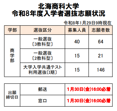 2026.01.28 お知らせ 入学者選抜 新着情報 令和8年度 一般選抜・大学入学共通テスト〔Ⅰ期〕 志願状況について 受験生の皆さんへ 試験の詳細は受験生応援サイトをご覧ください。 受験の際は、入学者選抜要項を必ずご確認ください。要項は受験生応援サイトでご覧になれます。