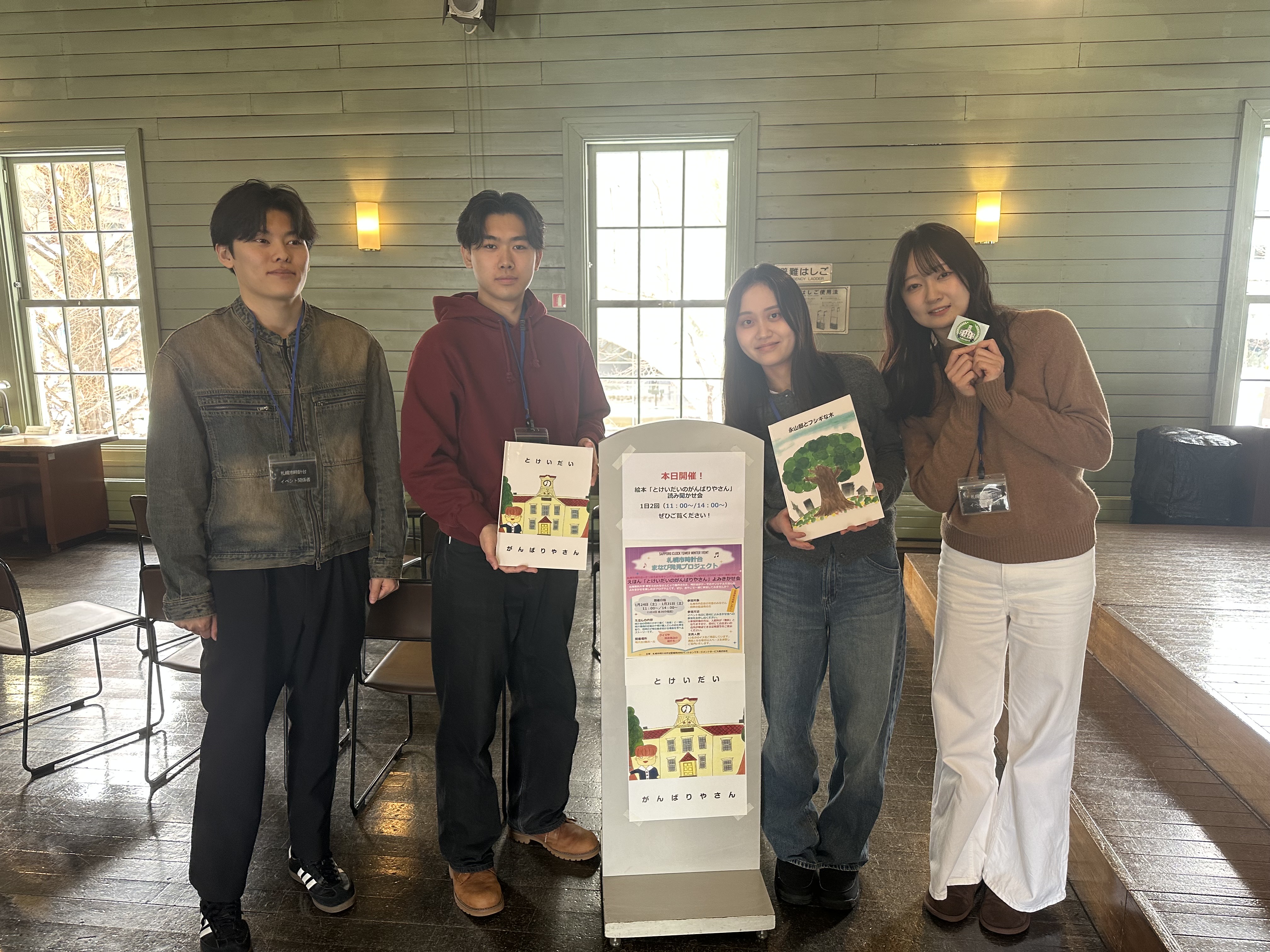 2025年1月24日(土)および31日(土)の2日間、郭ゼミの3年生の学生たちが、札幌市時計台にて絵本の読み聞かせイベントを開催しました。このイベントは、「札幌市時計台まなび発見プロジェクト」の一環として企画されたもので、地域の文化施設をテーマに、子どもから大人まで楽しめる学びの場を提供することを目的としています。