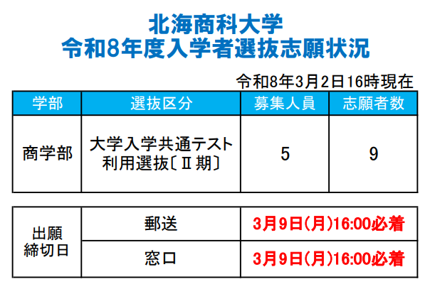 2026.03.02 お知らせ 入学者選抜 新着情報 令和8年度 大学入学共通テスト〔Ⅱ期〕 志願状況について 受験生の皆さんへ 試験の詳細は受験生応援サイトをご覧ください。 受験の際は、入学者選抜要項を必ずご確認ください。要項は受験生応援サイトでご覧になれます。